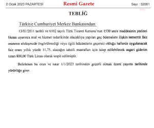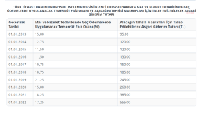 Öte yandan, alacaklıya yapılan geç ödemelere ilişkin faiz oranı 2022 yılında yüzde 17,25, alacağın tahsili masrafları için talep edilebilecek asgari gider tutarı da 555,00 liraydı.