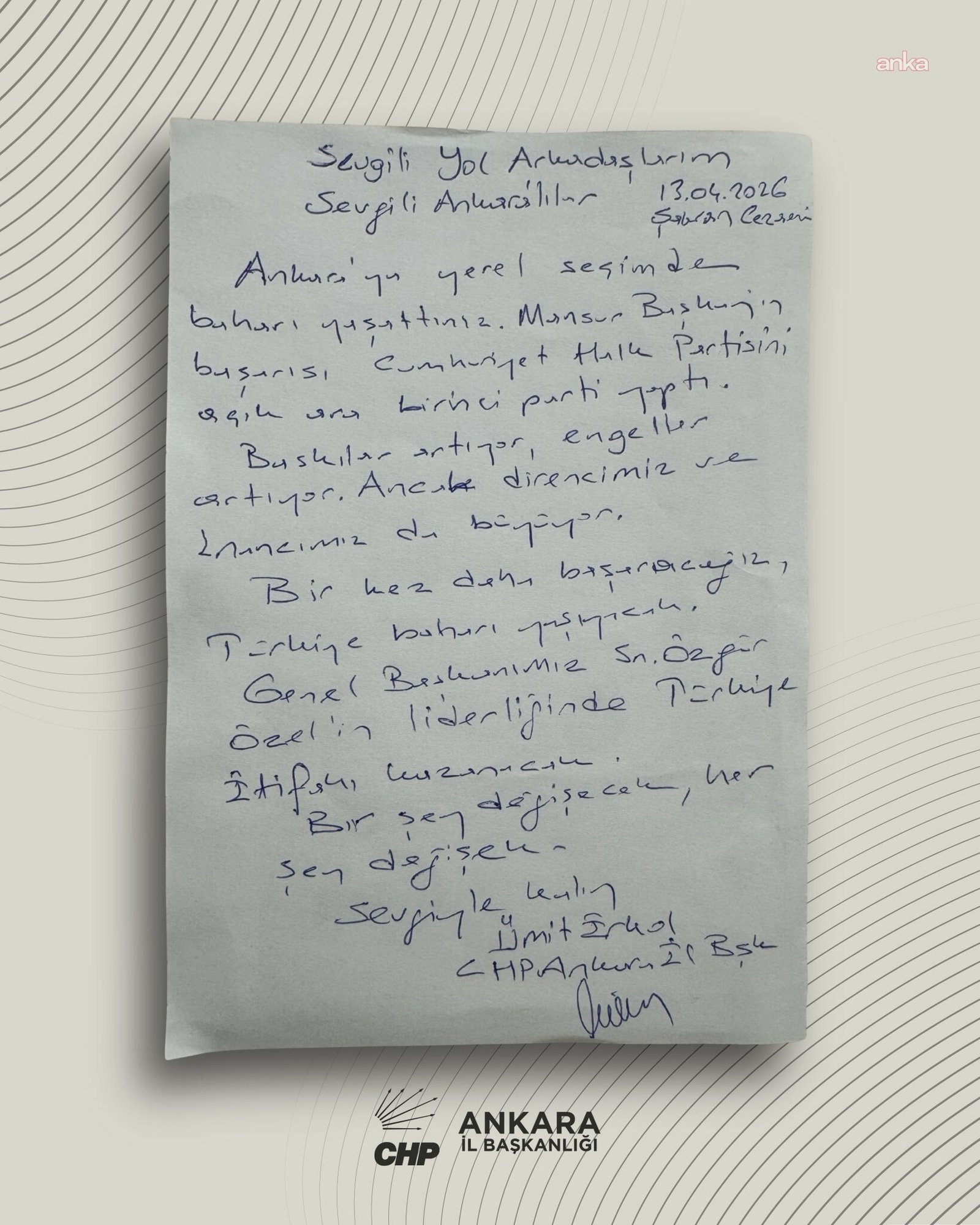 Ankara’ya yerel seçimde baharı yaşattınız. Mansur Başkan’ın başarısı, Cumhuriyet Halk Partisi’ni açık ara birinci parti yaptı. Baskılar artıyor, engeller artıyor. Ancak direncimiz ve inancımız da büyüyor. Bir kez daha başaracağız, Türkiye baharı yaşayacak. Genel Başkanımız Sn. Özgür Özel’in liderliğinde Türkiye İttifakı kazanacak. Bir şey değişecek, her şey değişecek. Sevgiyle kalın.”