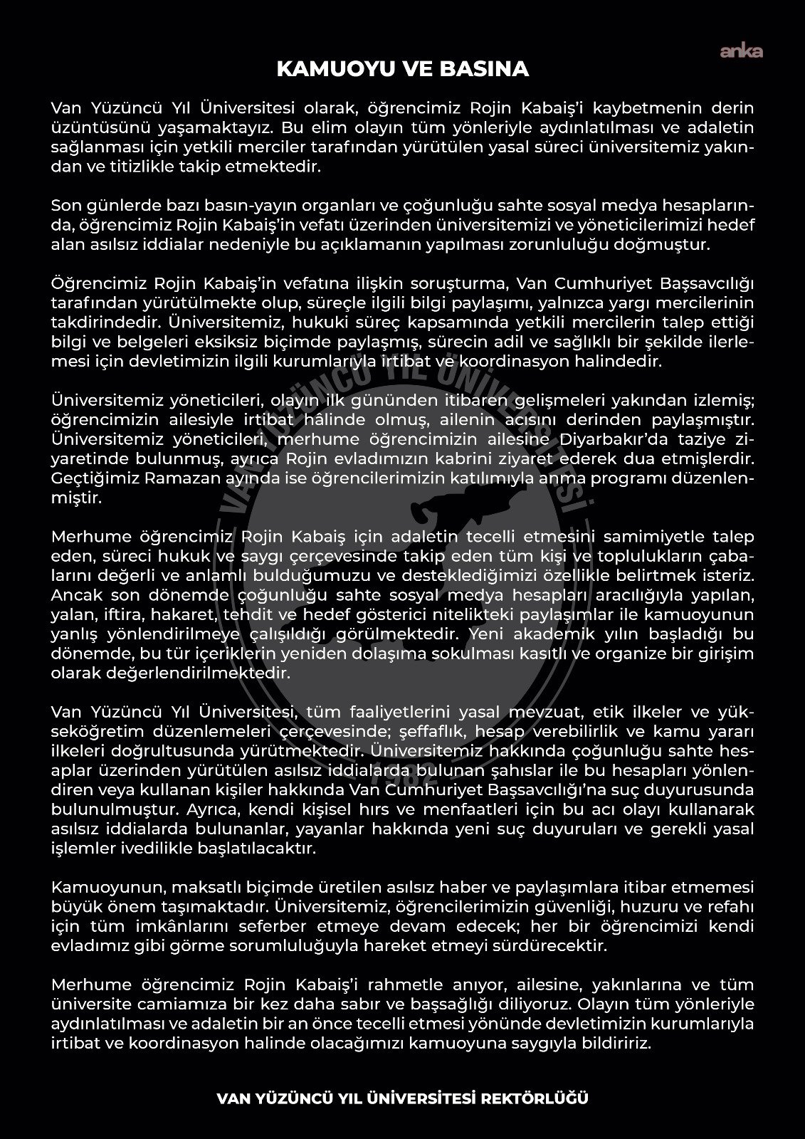 “Van Yüzüncü Yıl Üniversitesi olarak, öğrencimiz Rojin Kabaiş’i kaybetmenin derin üzüntüsünü yaşamaktayız. Bu elim olayın tüm yönleriyle aydınlatılması ve adaletin sağlanması için yetkili merciler tarafından yürütülen yasal süreci üniversitemiz yakından ve titizlikle takip etmektedir.