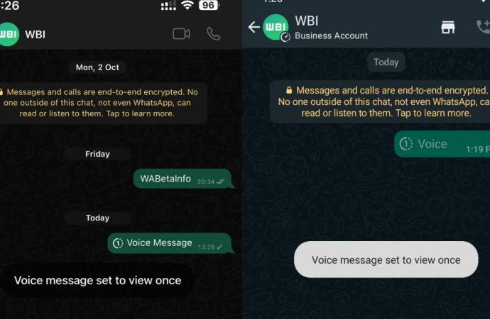 WABetainfoBu yüzden, WhatsApp’ın kendi kendini silen sesli mesaj özelliği de “Bir Kez Görüntüle” özelliği gibi göründüğü için kullanıcıların bu sesli mesajları da indiremeyecekleri veya kaydedemeyecekleri söylenebilir. WABetaInfo tarafından paylaşılan ekran görüntüsüne göre, alınan sesli mesajın yanında “1” butonu görünüyor. Bu özellik, WhatsApp Android beta uygulaması v2.23.22.4 ve WhatsApp iOS beta uygulaması v23.21.1.73’te görülebilir.